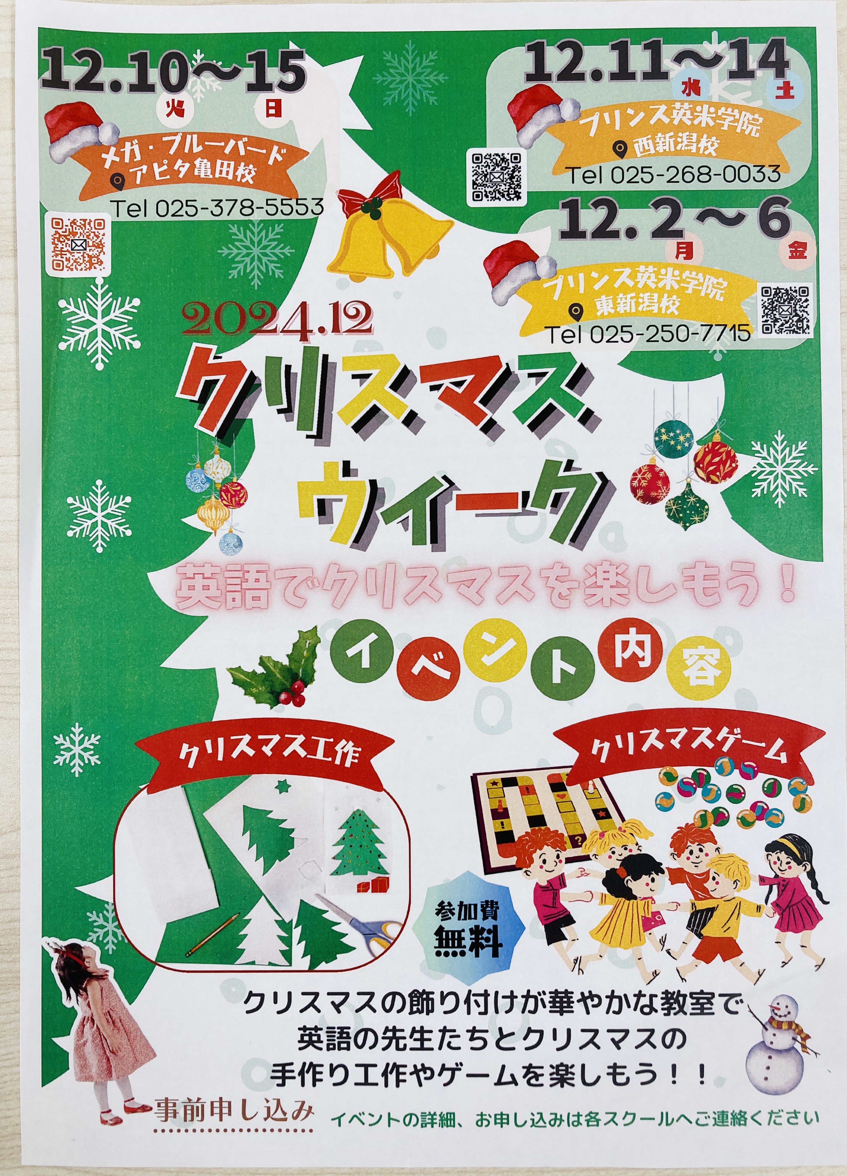 クリスマスウィークのお知らせ🎄🎅西新潟校 12月11日(水)〜14日(土)東新潟校 12月2日(月)〜7日(金)クリスマスゲーム♟️クリスマス工作✂️教室も少しずつクリスマスの雰囲気に🎄✨まだまだ飾りも増えます🪅🦌姉妹 ...