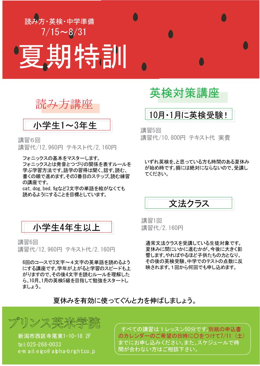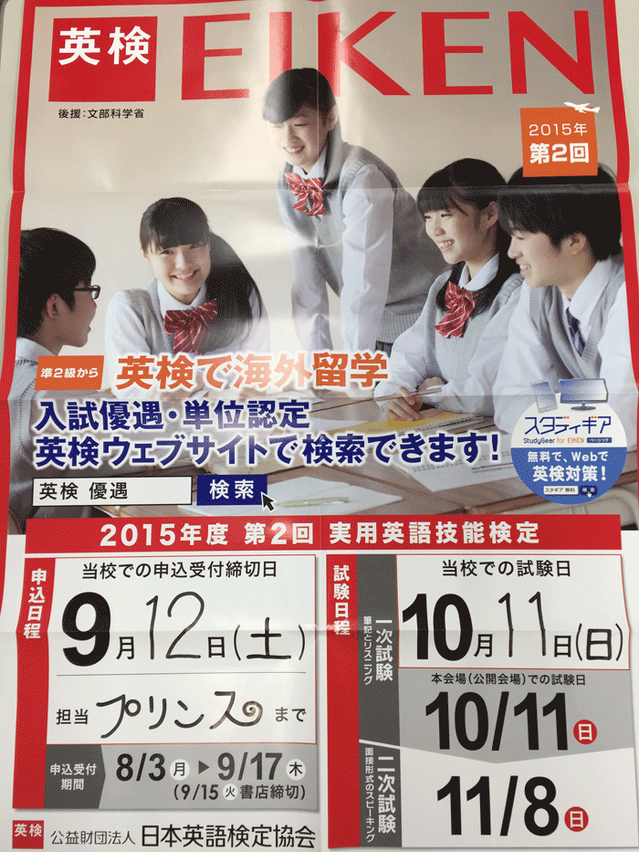 次回の英検は10月11日(日)です。10月受験を目指す生徒たちは、夏休みに夏期講習を受講しています。夏休みの努力も力になります!!10月の英検合格を目指してがんばりましょう!! ...