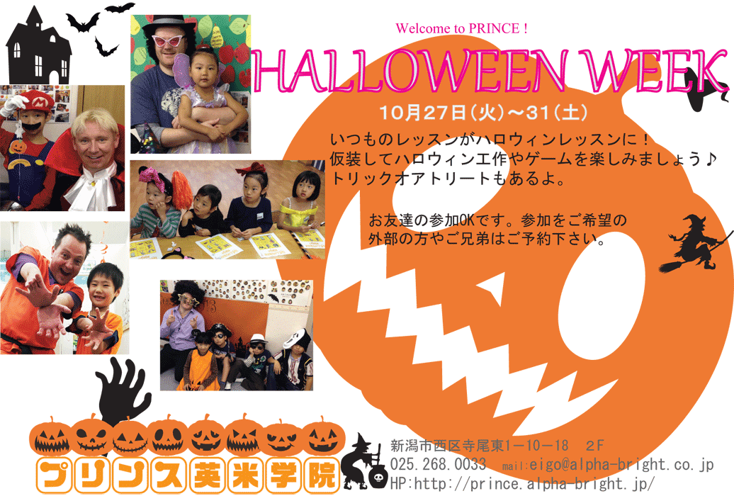 ** 10月27日(火)~31日(土)**ハロウィン特別レッスン♪♪仮装をして英会話レッスン、ハロウィンの工作、ゲームをします☆ Trick or Treat !!この週は学校や幼稚園のお友達も一緒に参加OK!! 講師もみんな仮装姿 ...