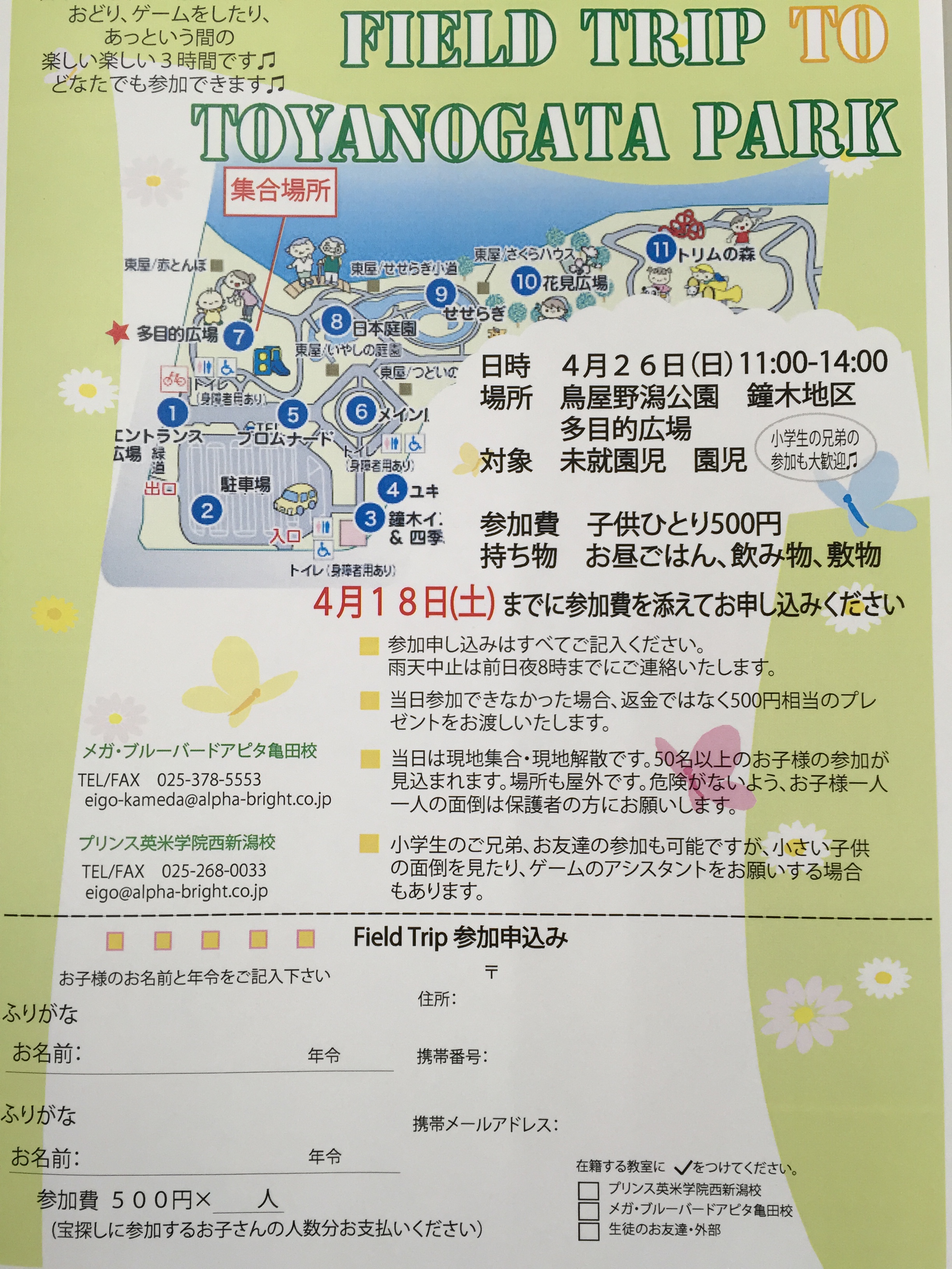 4月のイベントのお知らせです!4月26日(日)11:00-14:00 フィールドトリップ @鳥屋野公園 鐘木地区多目的広場みんなでランチを持参してピクニックやゲームをします♪♪お友達を誘っての参加も大歓迎です☆ ...