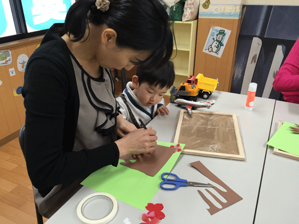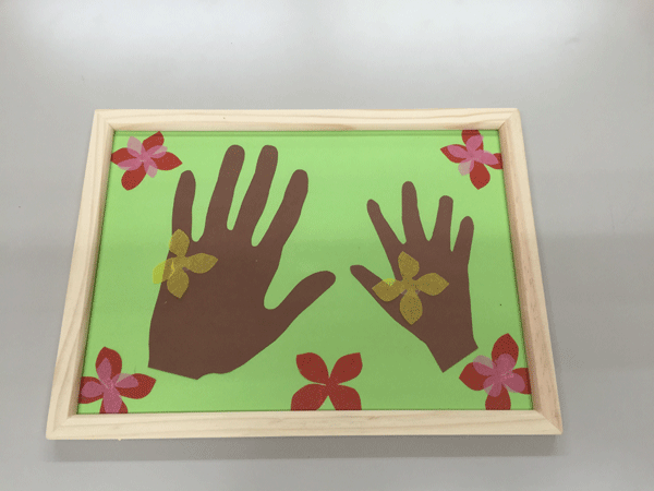 今月のクラフトは春の写真フレームデコです。子供の手形とお母さんの手形をとり、木に見立てます。そして、カラフルな花びらと写真でデコレーションしていきました。とっても可愛くできました。出来上がりに嬉しそう ...