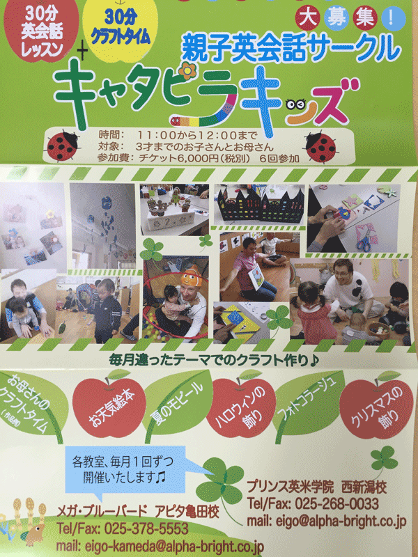 ◎6月23日(火)11:00~12:00 @プリンス ◎6月30日(火)11:00~12:00 @メガブルーバード亀田校前半の30分は親子で英会話レッスン後半の30分はお母さんの工作タイム&キッズのおもち・痺^イム、外国 ...