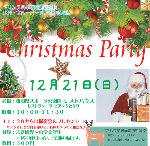 新潟で英会話といえばプリンス!プリンスと言えばイベントです!この時期イベントと言えば!クリスマスパーティーです!!!今年も元気良く開催いたします対象は未就園児~小学2年生(小学3年生以上でも参加はでき ...