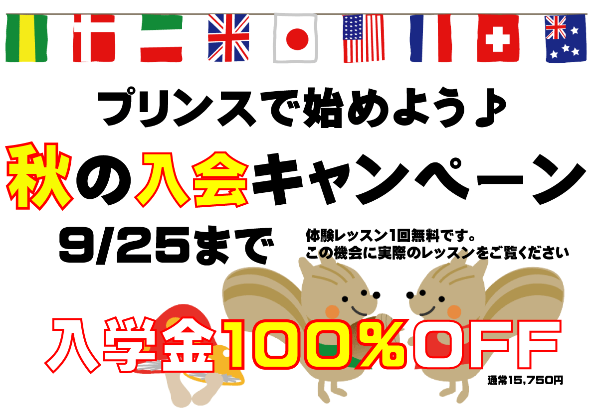 涼しくなってきた秋!英語をプリンスではじめましょう!9月25日までのお申込で通常15,750円の入学金が無料で始めることができます!教室は英会話レッスン、文法レッスン、アクトクラブなど多彩なクラスがあります。 ...