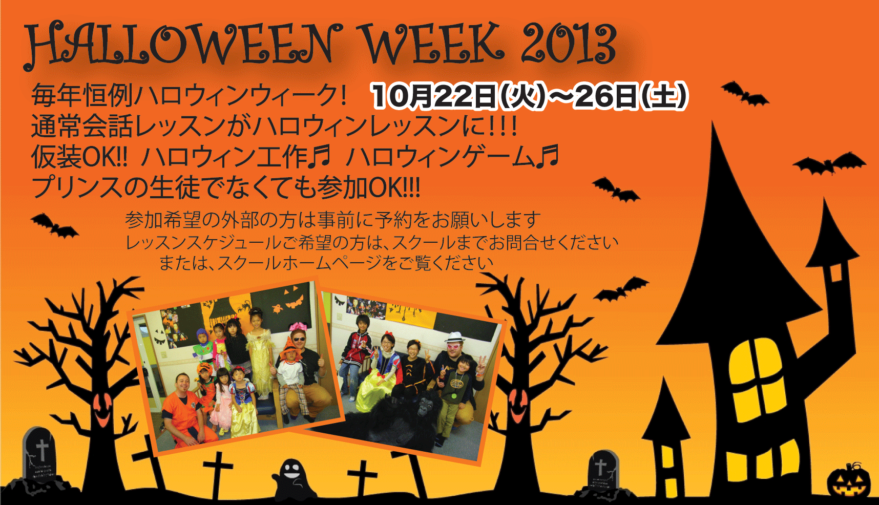 秋は検定や行事がもりだくさん!英検・児童英検はプリンスが受験会場です。申込書は今配布中です。10月後半にはハロウィンウィークを開催します。火曜から土曜までレッスンは全てハロウィン仕様!お友達の参加もOK ...