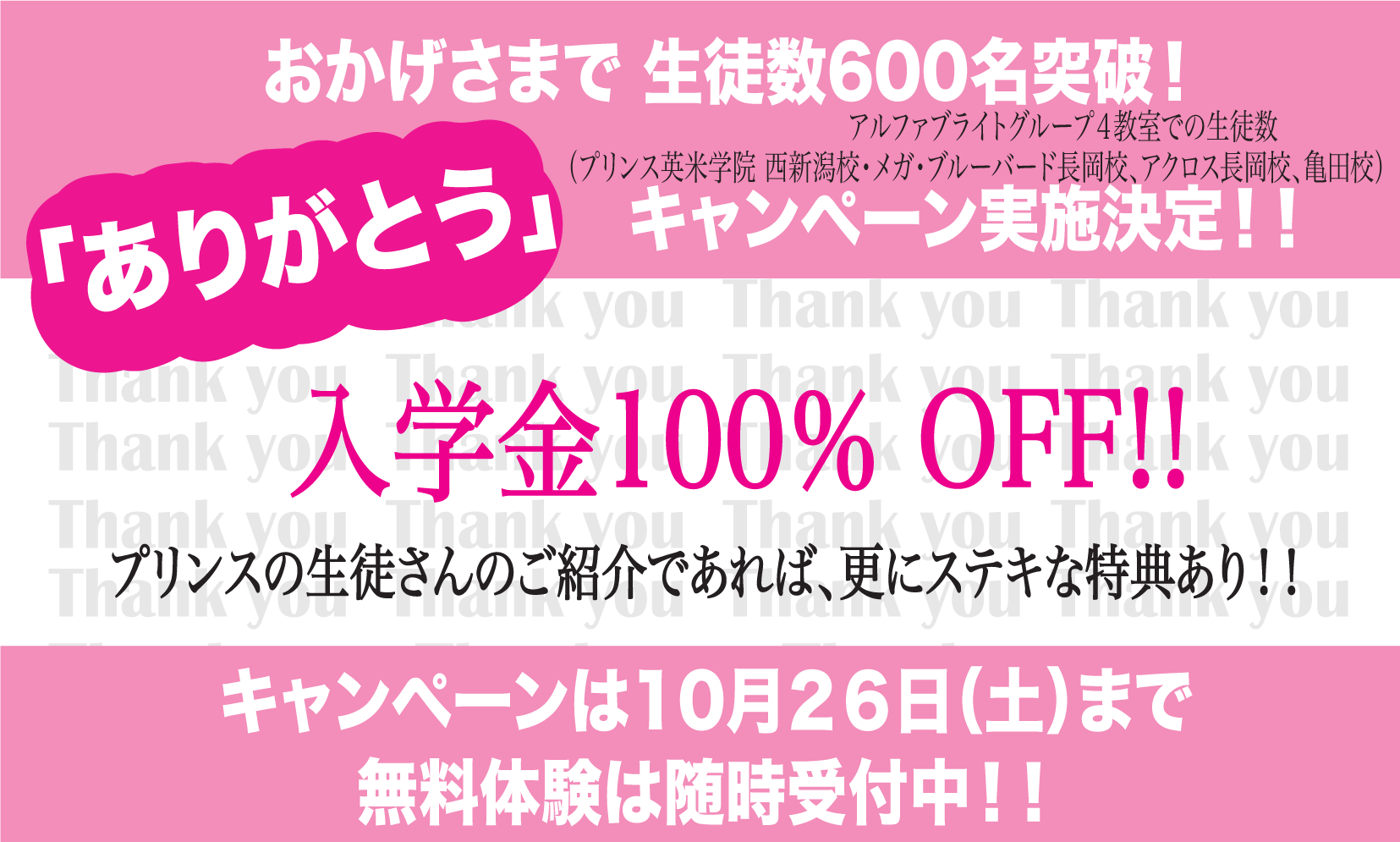 おかげさまで、生徒数「600名」を達成!!アルファブライトグループ(プリンス西新潟、メガ・ブルーバード長岡校、アクロス長岡校、アピタ亀田校)この4教室で600名を達成しました。これを記念して、「ありが ...