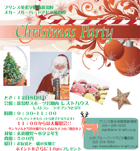 12月8日(日)クリスマスパーティー開催いたします!対象年齢:未就園児~小学2年生英語の単語を使ってのゲームをしたり、英語の歌を歌ったり、たのしく4人の外国人講師と一緒に楽しく過ごしませんか?もちろん ...