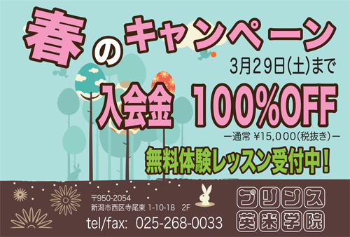 春です!新しい事を始める季節です!英会話を始めましょう!!プリンスで楽しく英会話英文法で更に会話力をアップさせましょう♪入会特典入会金100%OFFです。3月29日(土)まで。まずは、無料体験レッスンをご ...
