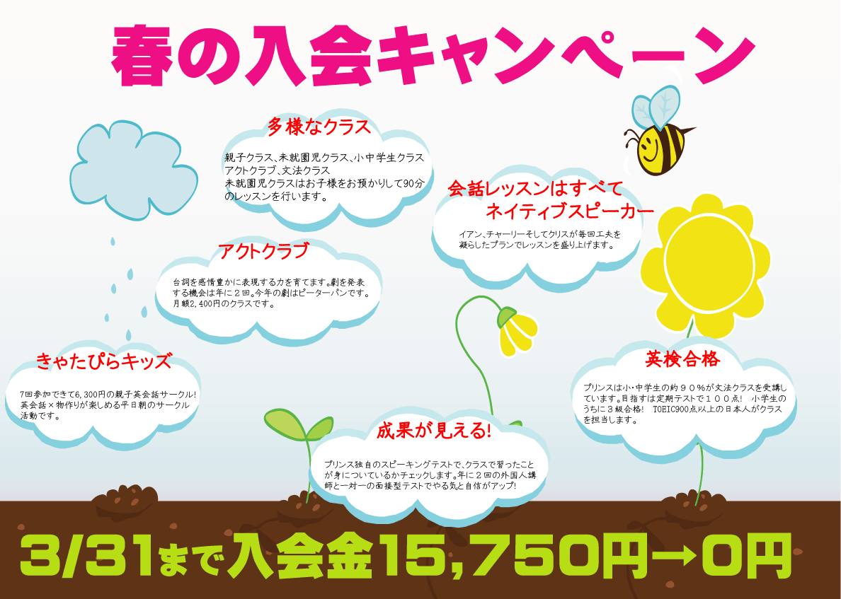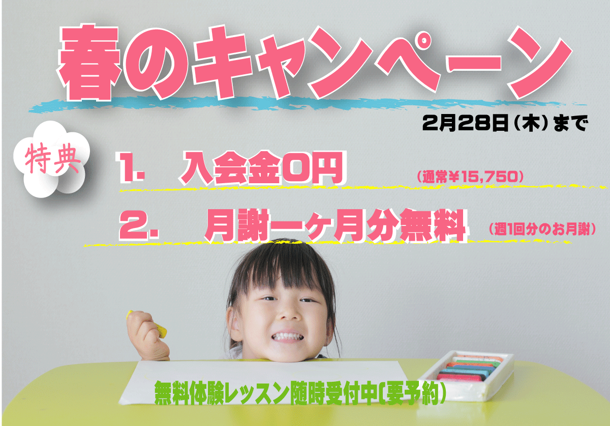 3月末までにお申込ただいた方は入会金15,750円が無料になるキャンペーンを行っております。3月中にぜひ体験レッスンにお越しください。実際のレッスンは4月から始めてもOKです。 ...