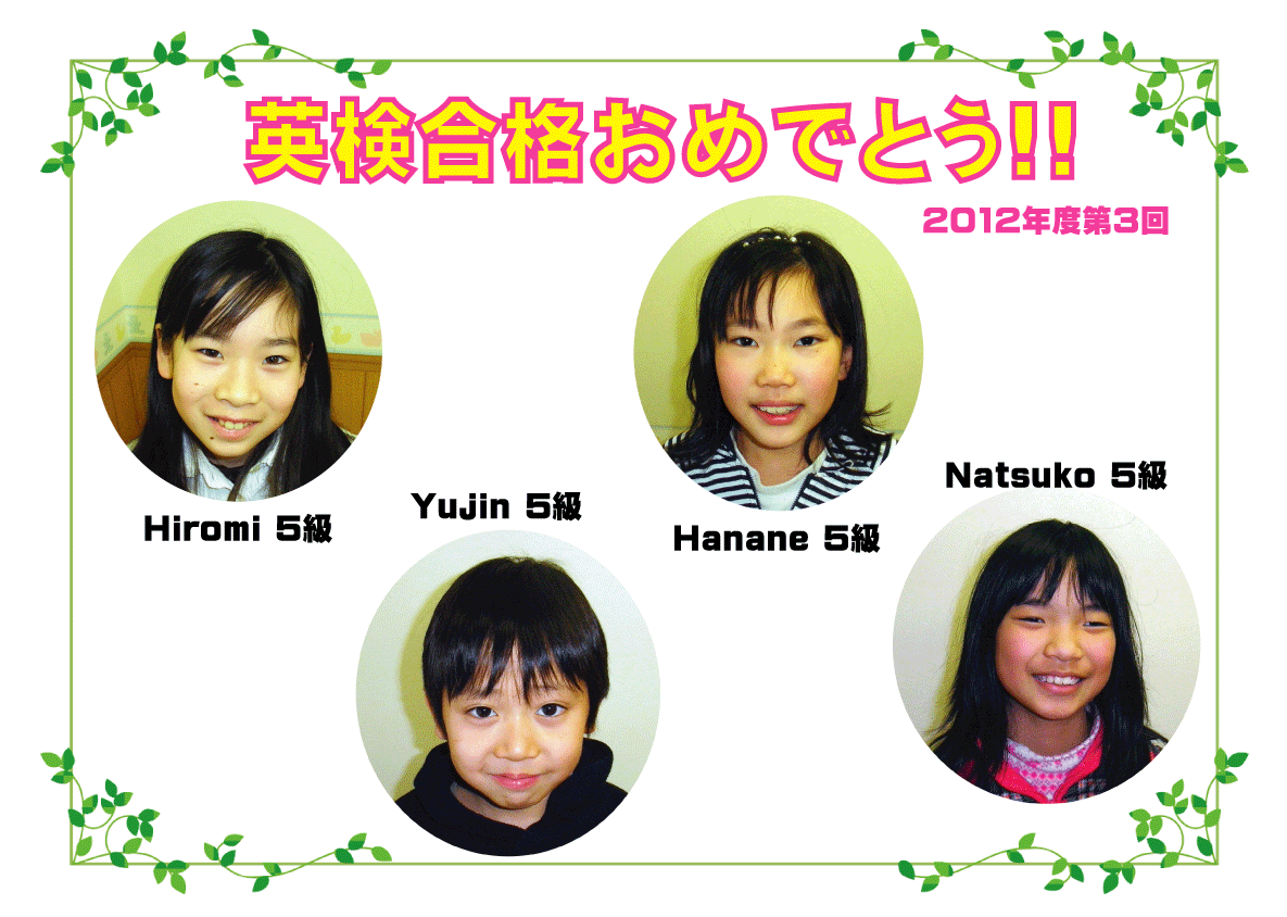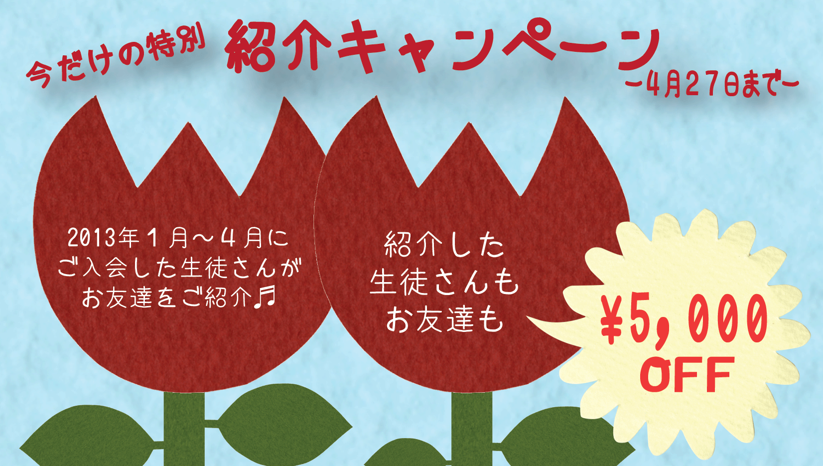 2013年1月~4月までに入会した方を対象に、お友達紹介キャンペーンを実施中です紹介した方も、された方も¥5000円オフの特典付きです!4月27日までですので、無料体験レッスンはお早めに(^^)春から一緒に英会 ...