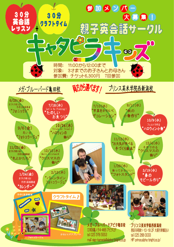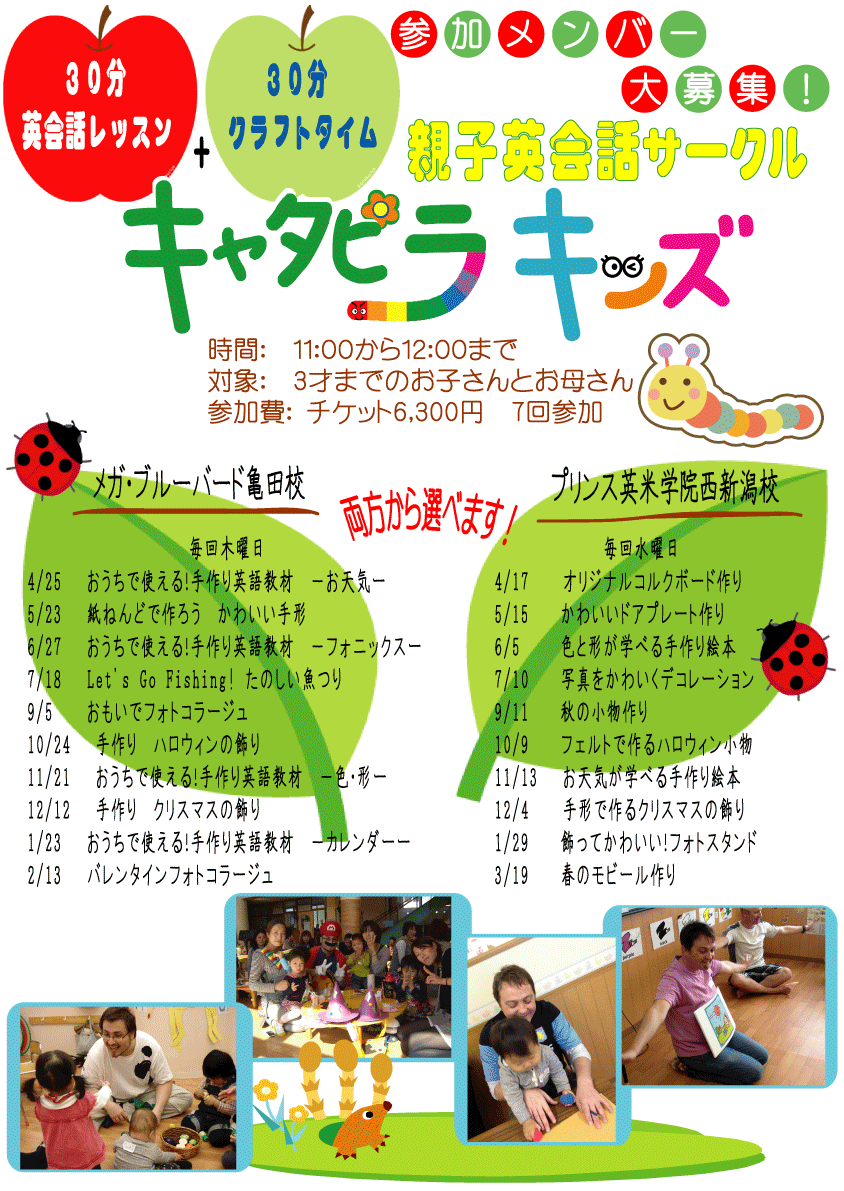 4月から始まる「きゃたぴらきっず」は親子で参加できる英語サークルです。平日の午前11時からの一時間をプリンスで、英語&クラフトを楽しみましょう!・Nラフトは主にお母さんが作ります♪その間はお子さんと外国人 ...
