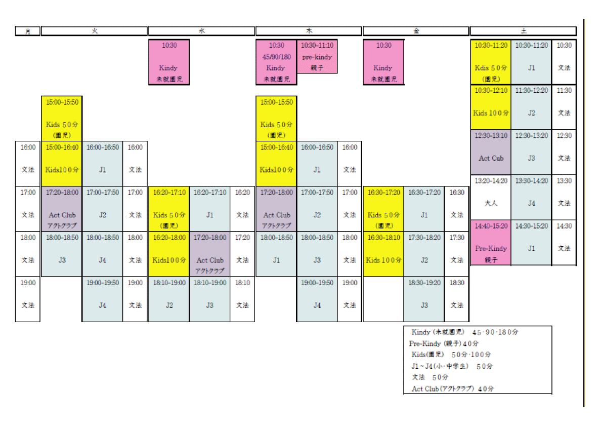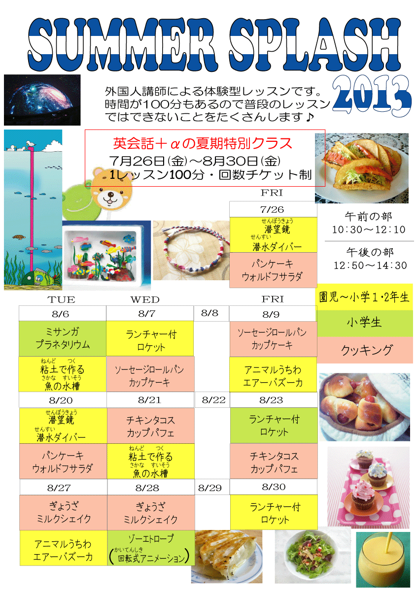 7月26日から8月30日の間、教室では100分間の夏季限定クラス、サマースプラッシュを開催します。工作やお・ソ理を100分間英語で楽しみます。参加をご希望の方は、お電話やメール、直接教室でお申込ください。1回から ...