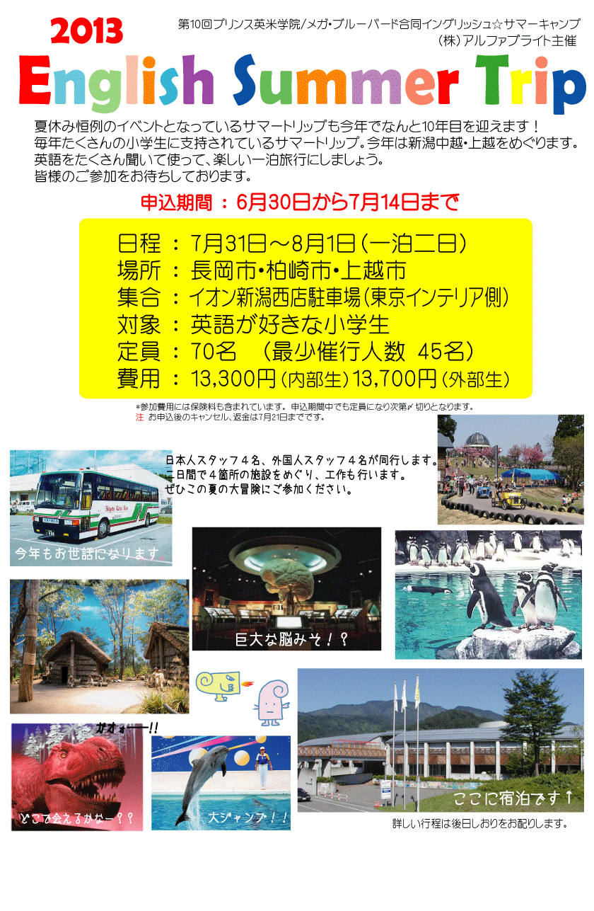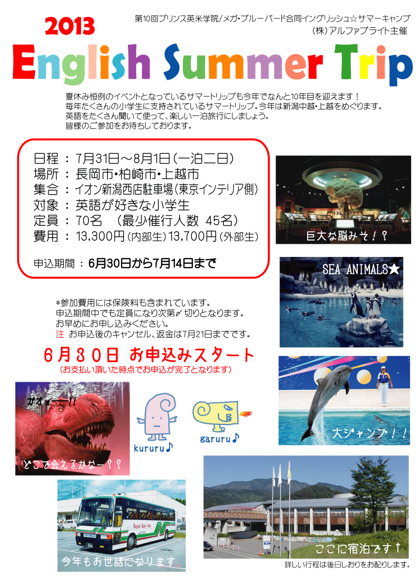 今年でサマートリップは10回目!行き先は柏崎と上越です。一日目は長岡の歴史博物館と柏崎のこども自然王国へ行きます。二日目は上越の水族館と科学館へ出かけます。旅行は外国人スタッフ4名と日本人スタッフ4名 ...