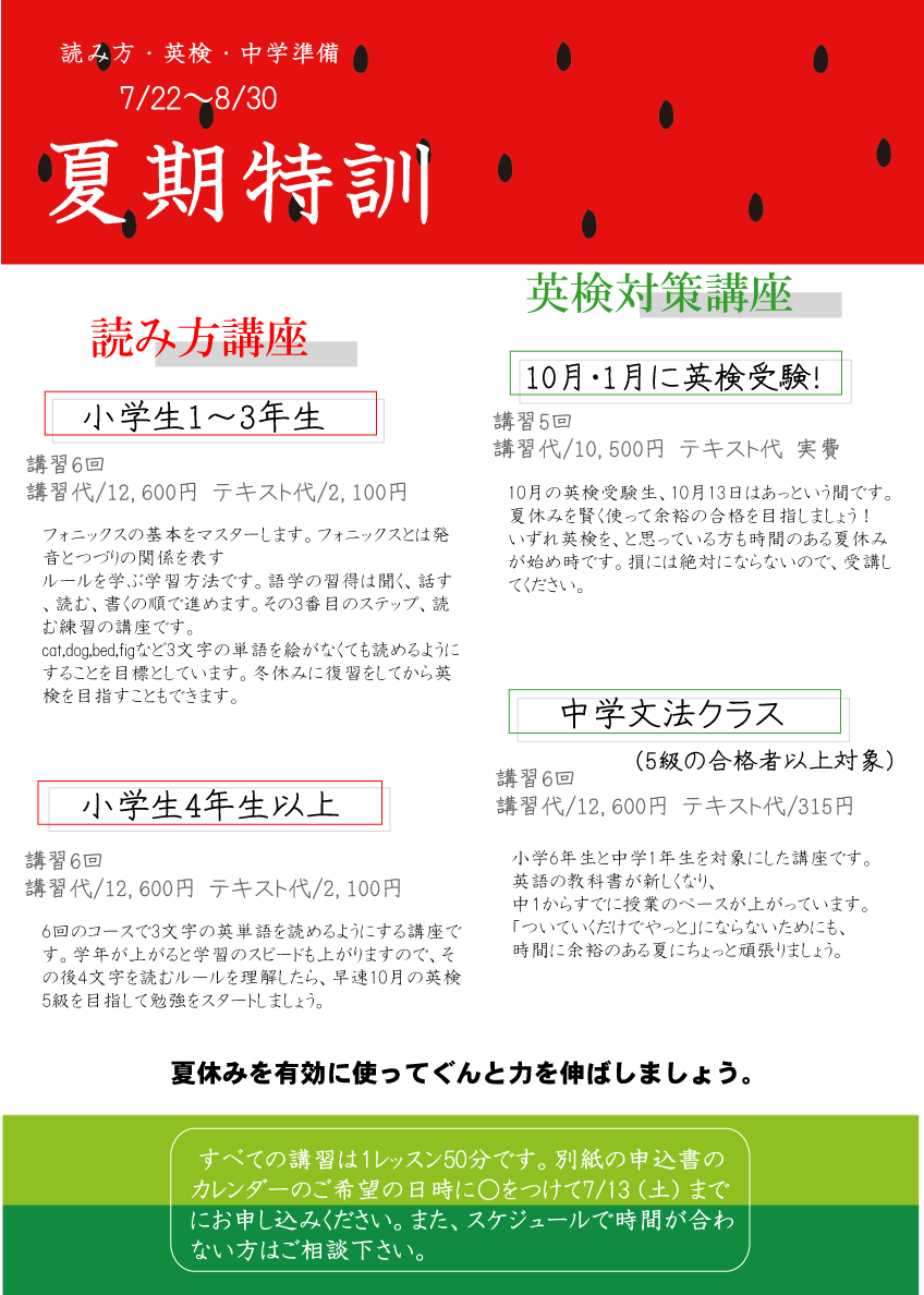 プリンスの夏期講習は二種類あり、一つは10月や1月の英検合格を目指すための文法講習、もう一つは英単語を自力で読めるように練習をするフォニックス講習です。プリンスに通う小学生は3年生までにフォニックス講 ...