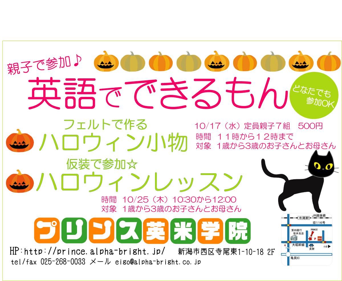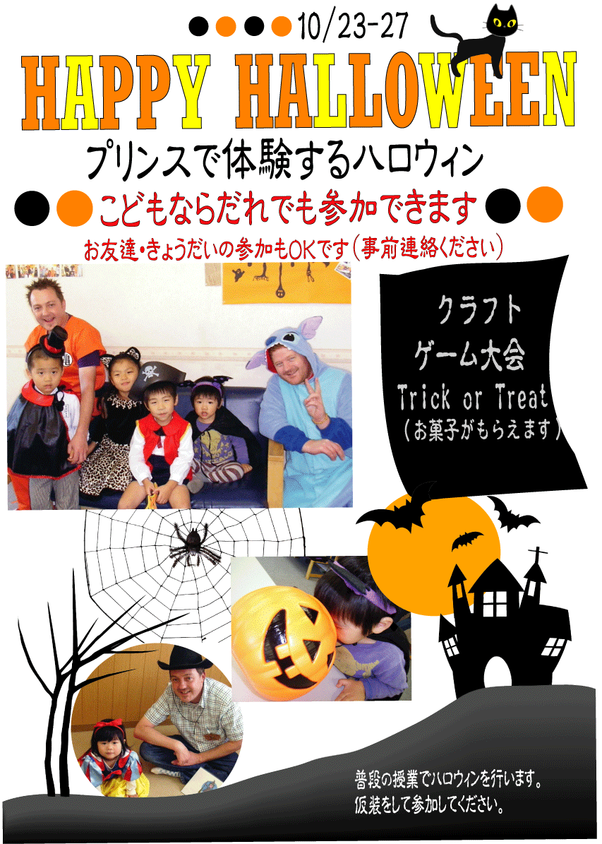 プリンスでは10月23日から27日の間、すべてのレッスンをハロウィン仕様で行います。工夫した仮装でレッスンに参加してください。レッスンではゲームやクラフト、お楽しみのトリックオアトリートも行います。生徒のお ...