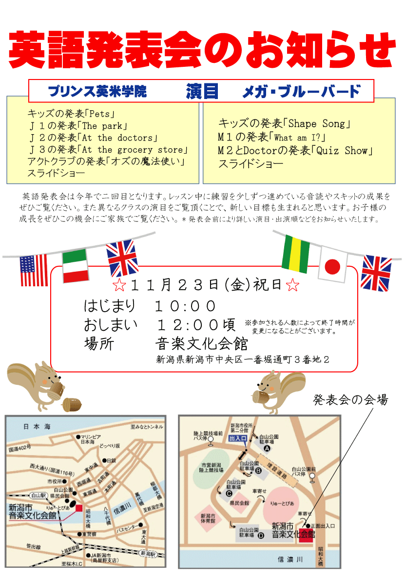 11月23日は家族みなさんで、お子さんの英会話レッスンの成果をご覧いただける、発表会の日です。今回場所は中央区の音楽文化会館です。日ごろのレッスンの成果や他の学年の発表をぜひご覧ください。11月10日までにお ...