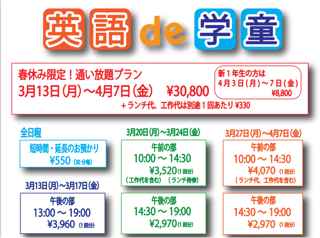 『英語de学童』の春休み利用についてのお知らせです🌸 今年も、内部生のみならず、外部生のご利用もOK👌春休み前の、学校早帰りが始まる頃からのご利用も可能です! ・3月13日(月)~17日(金) 午後のみのお預か ...