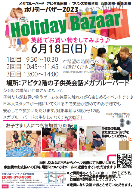 今年もホリデーバザーを開催します!スクール内に作られた縁日で、英語を使って買い物やゲームを楽しみましょう!最後にはくじ引き大会で、豪華景品がもらえるかも…💛 日にち … 6月18日(日)時間 ...