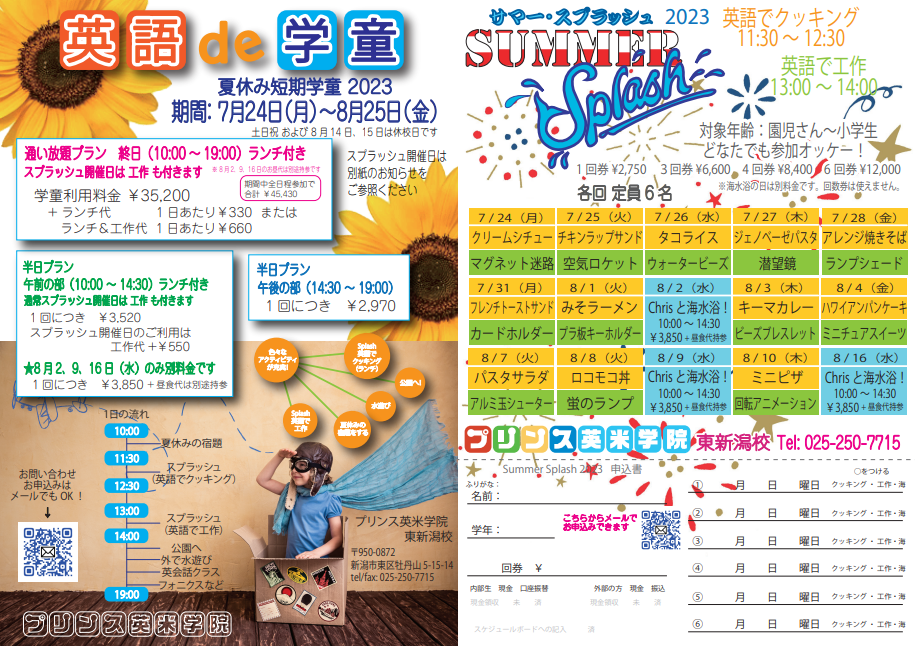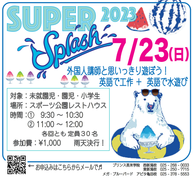 新潟も夏の暑さになってきましたね💦 ということで!今年もSuper Splash開催します🌊 英語で工作!英語でゲーム!そして英語で水鉄砲遊び!!!みんなでびしょ濡れになって夏を満喫しましょう🌞🌞🌞 日にち 7月23日 ...