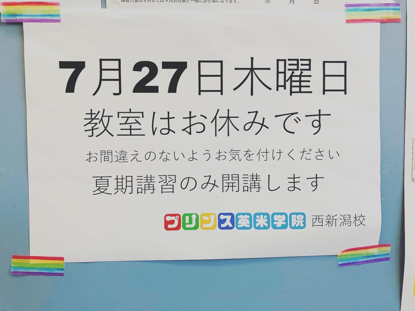 7月の教室お休み🌈7月27日木曜日は通常レッスンがお休みです。が、夏期講習は1日開講です❗️🌻まだまだお申込み受付中です♪教室に通っていない外部の方も受講できます🙆‍♀️長い夏休み中に英語を始めてみよう ...