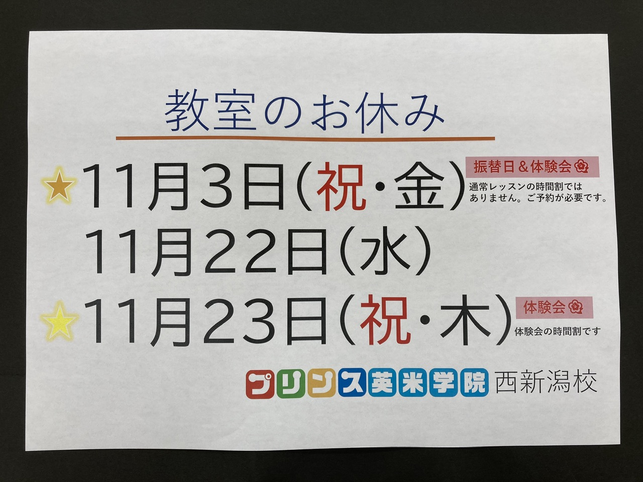 11月教室のお休み🌕🎑 ⭐️11月3日㊗️金は内部生の振替日と合同体験会です❗️時間割は体験会のお知らせをご覧ください👀欠席した方は振替レッスンをご予約ください🙂 ⭐️11月23日㊗️木は体験会です‼️未満児さ ...