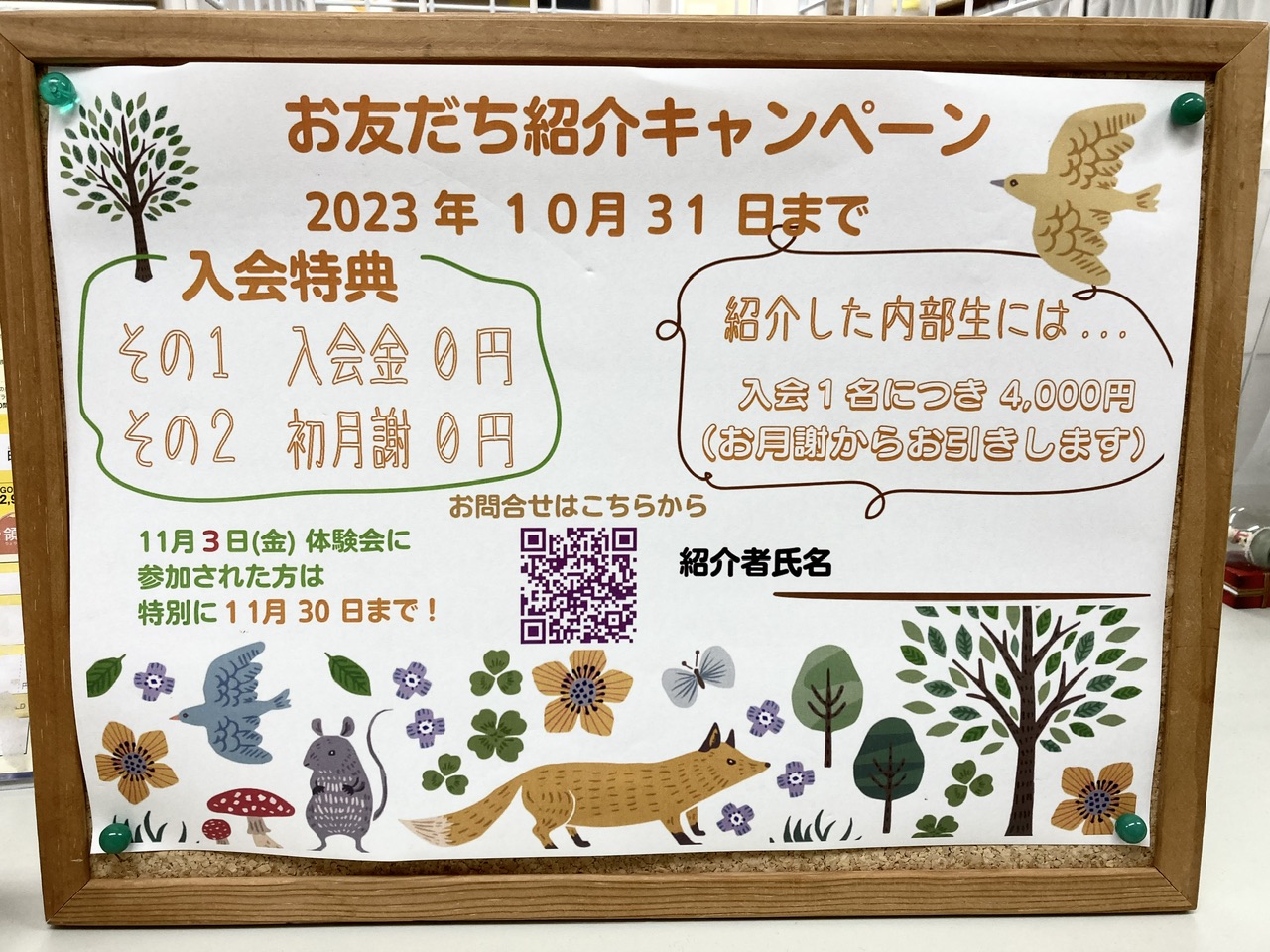 11月体験会を開催します‼️ ⭐️11月3日㊗️金は内部生の振替日と合同体験会です❗️欠席した方は振替レッスンをご予約ください🙂秋の紹介キャンペーンも実施中🍁🎃写真2枚目をご覧ください👀⭐️11月23日㊗️木は ...