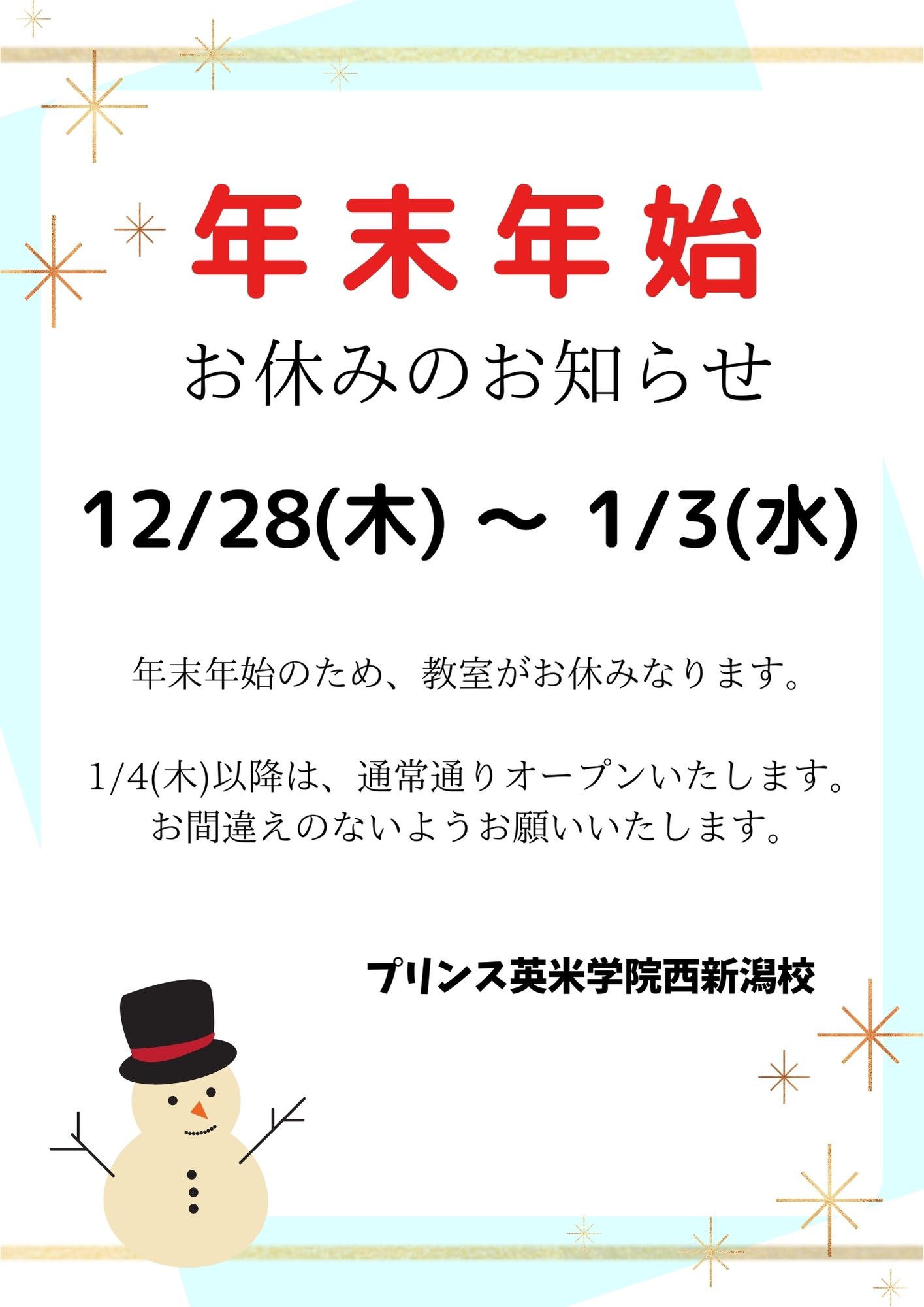 【西新潟校】年末年始のお休みのお知らせです12月28日(木)~1月3日(水)1月4日(木)14:00から通常です。今年も1年、ありがとうございました。よい年末年始をお過ごしください。来年もまたお待ちしてお ...