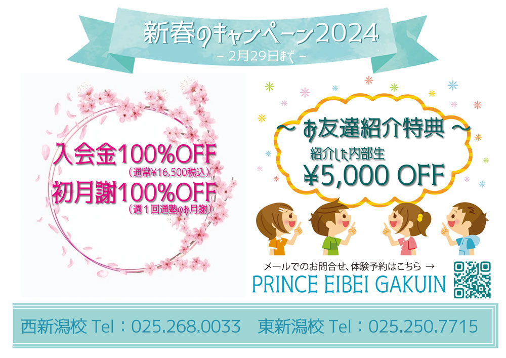 新春ご入会キャンペーンを実施しております! 2月末までのご入会で⭐入会金 通常16,500円⏩️0円‼️⭐初月謝 通常8,250円⏩️0円‼️ さらに、お友達紹介をしてくれた内部生には⭐お月謝から5,000円OFF‼️⭐スタン ...